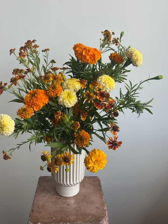 Flowers to expect in October: Dahlias / Dried flowers / Gomphrena / Fresh Grasses / Marigolds / Mums